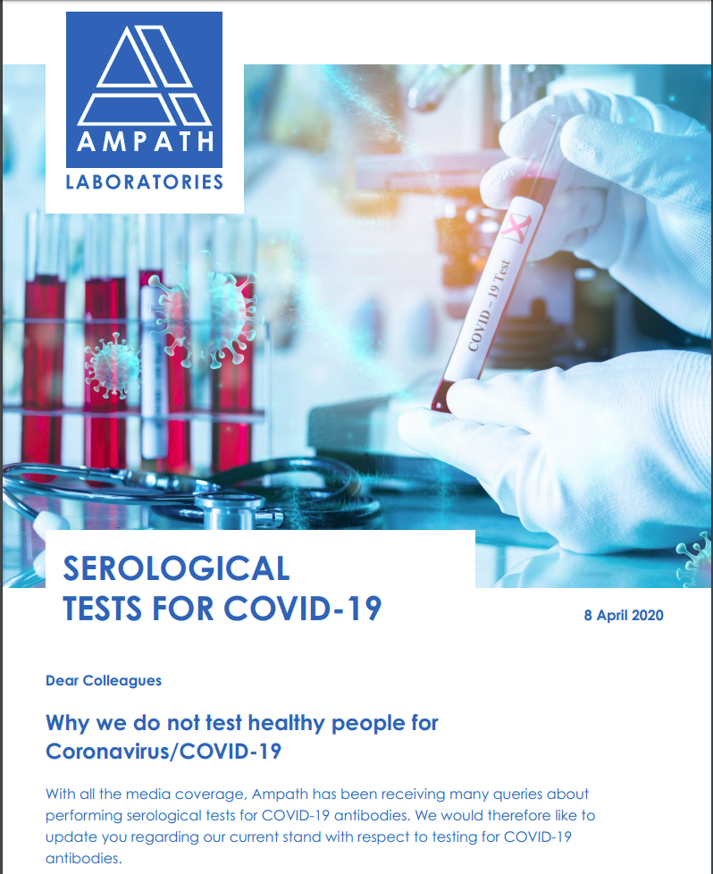 Why we do not test healthy people for Coronavirus/COVID-19. With all the media coverage, Ampath has been receiving many queries about performing serological tests for COVID-19 antibodies. We would therefore like to update you regarding our current stand with respect to testing for COVID-19 antibodies....